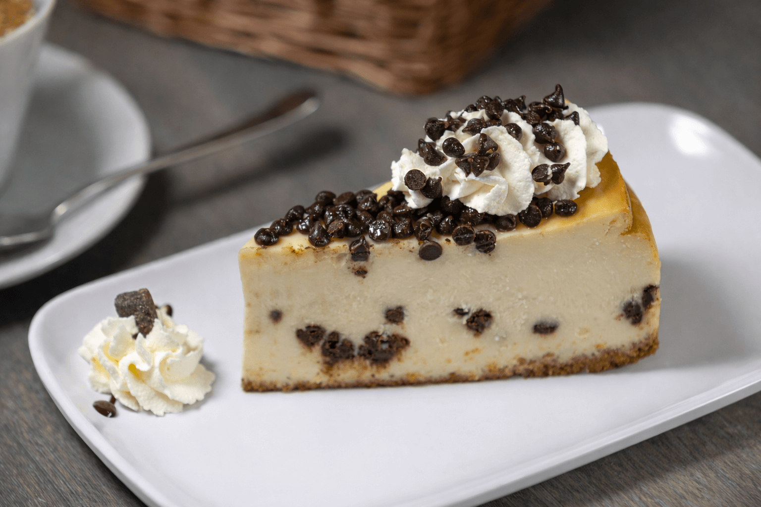 Dark chocolate chips join the creamiest filling around, creating an irresistible play of sweetness and intensity, perfect for those seeking a chocolate treat with a light touch.Creamy cheesecake is generously dotted with premium chocolate chips, bringing bursts of chocolate flavor in every bite. The smooth, rich filling pairs beautifully with a traditional graham cracker crust that offers a subtle buttery crunch.