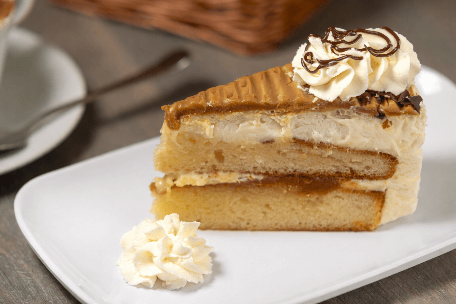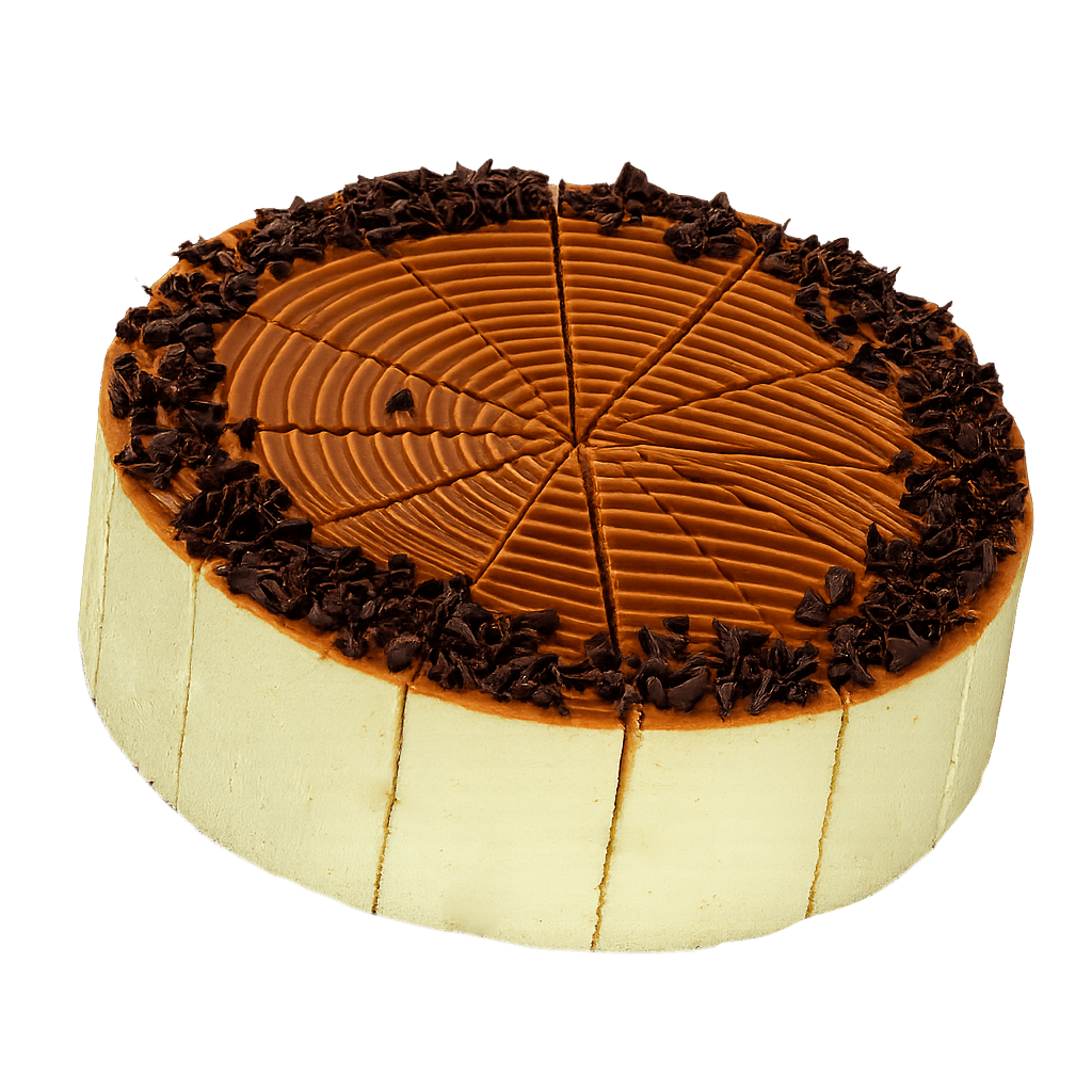 This cake pairs soft vanilla sponge with generous swirls of dulce de leche-style salted caramel for a warm, rounded sweetness. Dark chocolate curls bring a deeper cocoa edge and a refined finish. The result is creamy, comforting, and layered in flavor: ideal for those who love caramel desserts with a touch of intensity.