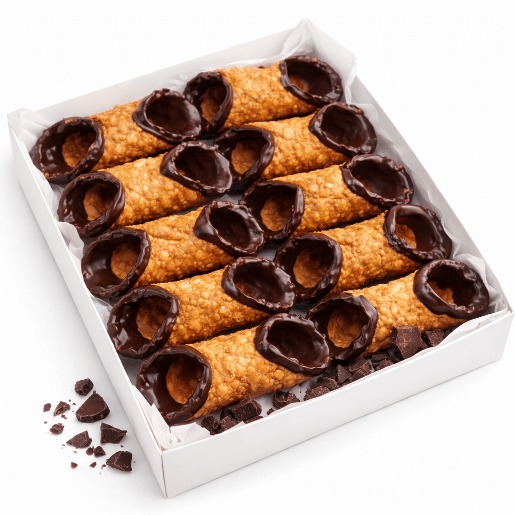 Our Large Chocolate Cannoli shells are fried until golden and bubbly for that signature crunch, then finished with a glossy chocolate coating on each end. They’re delivered empty, ready to be filled at service with ricotta cream, pastry cream, or any specialty filling: ideal for keeping the shell crisp until the moment you serve.