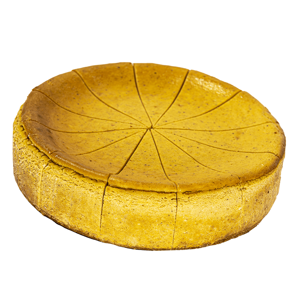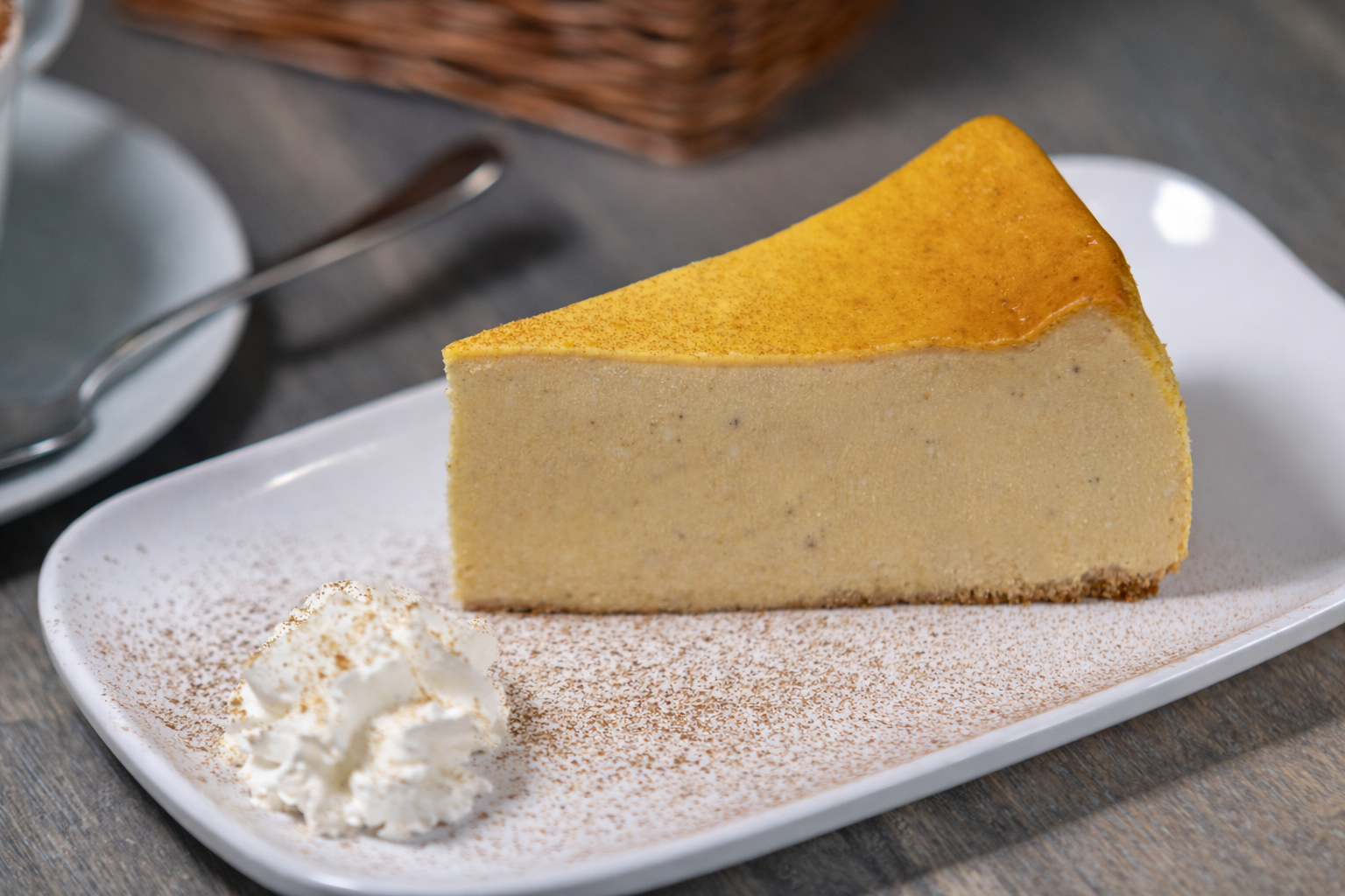 Velvety smooth cheesecake is infused with real pumpkin purée and traditional fall spices like cinnamon, nutmeg, and cloves. The creamy filling sits atop a buttery graham cracker base that adds just the right balance of texture.